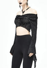 Black and silver ironed burnt velvet off the shoulder flared long sleeved top.