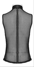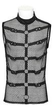 Black fishnet mesh shirt with buckle and O-ring details on the front with pleather collar. Back of shirt has a studded spine. Shirt has a zip closure.