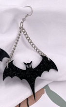 Silver hook earring with silver chain and black sparkly bat charm hanging from chain.