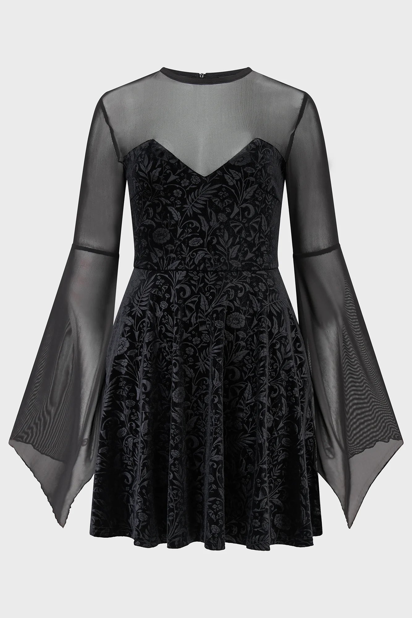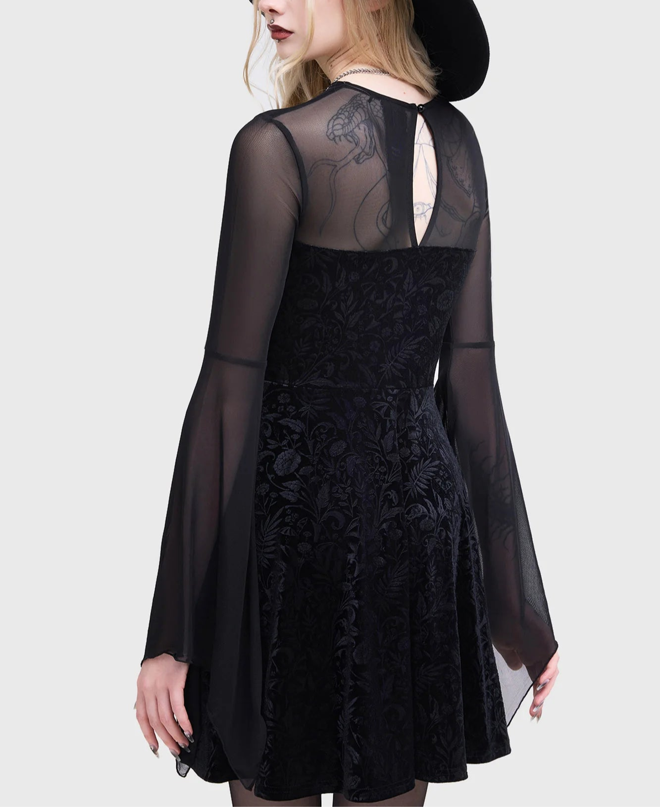 Black soft stretch long sleeve velvet dress with embossed velvet print, mini length and mesh front/back detail.