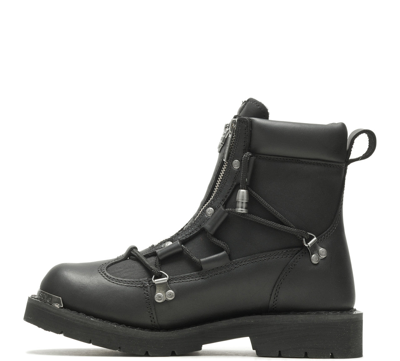 Black boot with full grain leather upper and an oil-resistant rubber outsole, full length cushion sock lining, Goodyear® welt construction and Ykk® locking twin zippers.