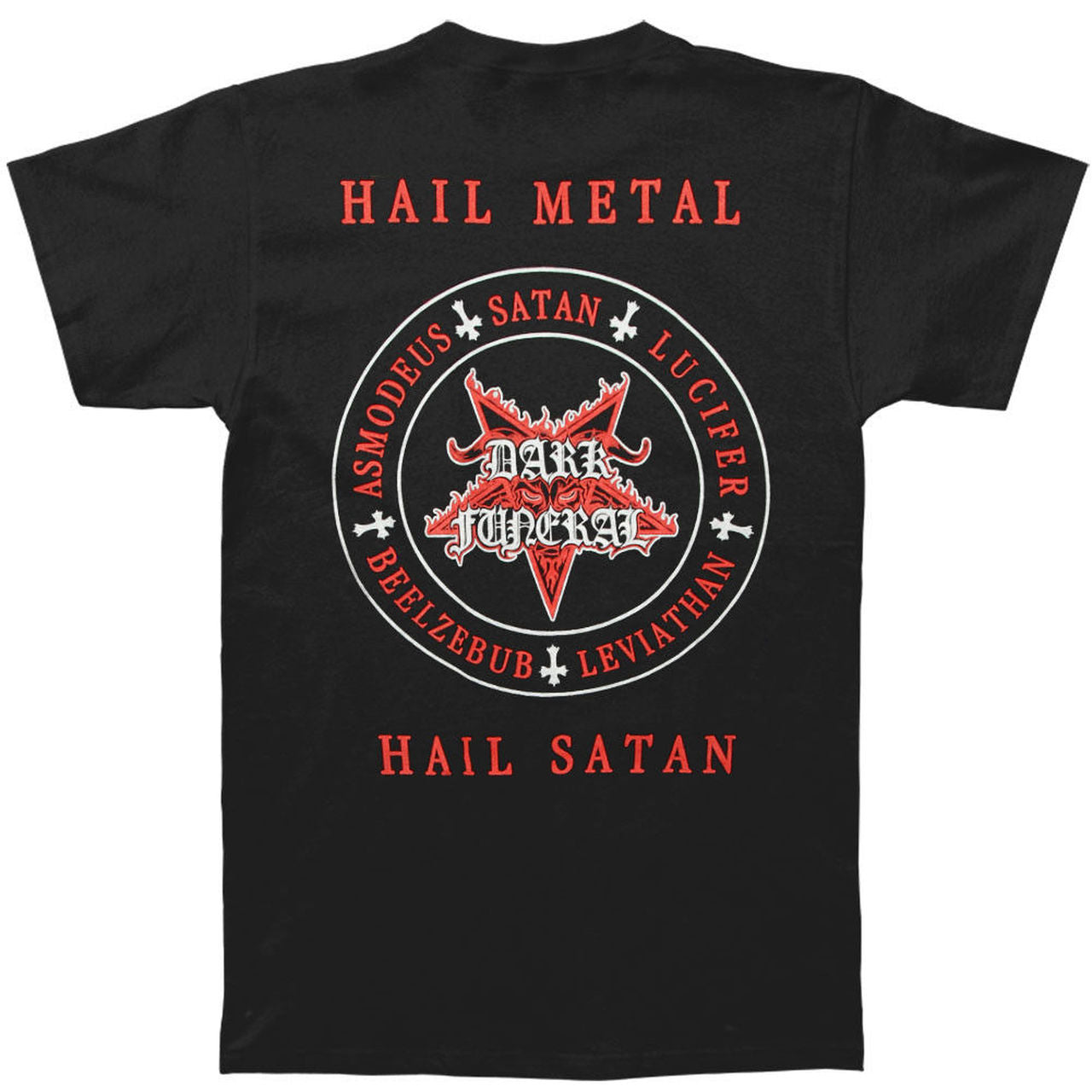 Black t-shirt with Dark Funeral Swedish Black Metal gray, white and red colored design printed on the front and back.